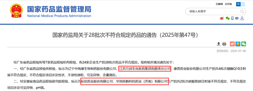 通告显示,江苏万邦生化医药集团有限责任公司(以下简称“江苏万邦”)生产的辅酶Q10注射液被检出多项内容不符合规定,出现可见异物。