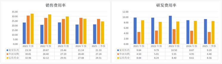 医药行业的“重营销、轻研发”已是老生常谈,这种财务结构的失衡直接转嫁为质量风险。以华润双鹤、辰欣药业为例,近年的销售费用每年都超过二十五亿元,占营业收入的比例几乎都超过25%,而同期研发费用却不足销售费用的三分之一。