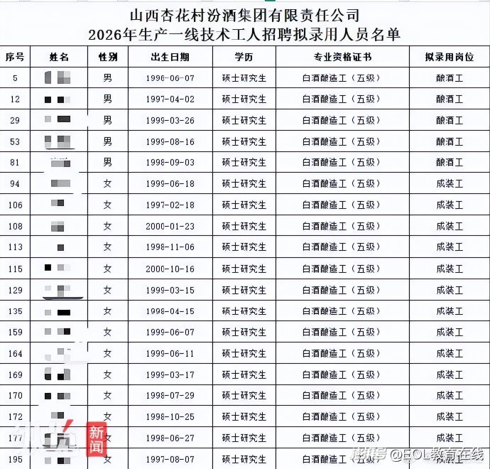 近日,山西杏花村汾酒集团公示了2026年生产一线技术工人招聘拟录用人员名单。名单中,酿酒工和成装工岗位拟录用人员中出现了19名硕士研究生,引发关注和热议。