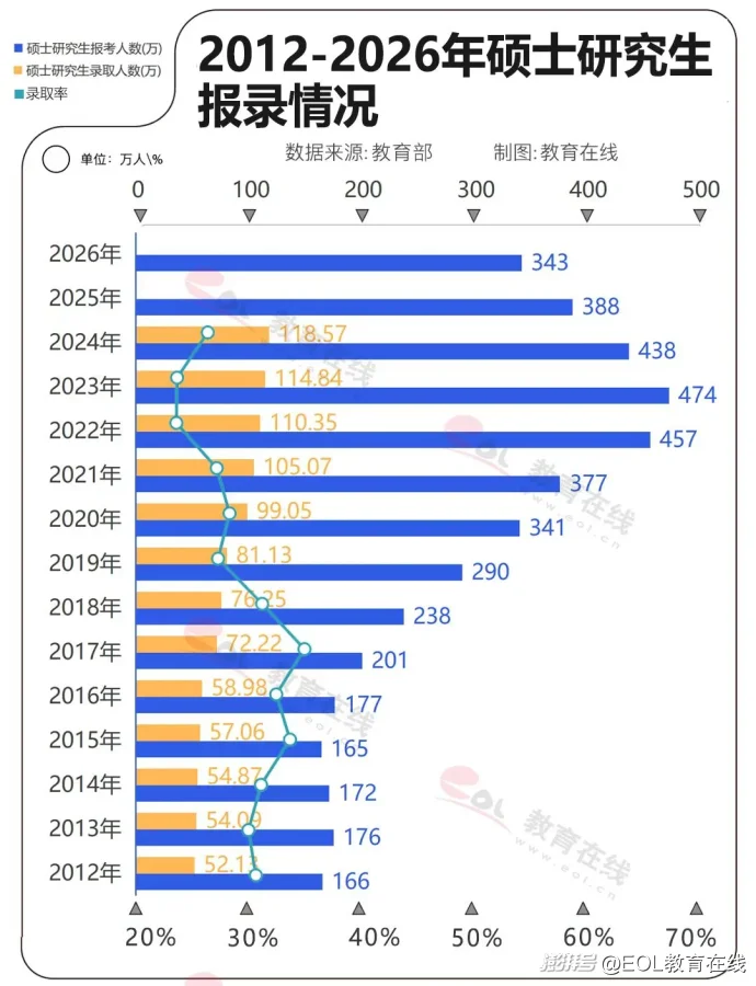 近年来,我国硕士研究生连续扩招。据教育部介绍,2022年,我国在学研究生已经达到365万人,总规模位居世界第二,已经成为研究生教育大国。国家统计局发布的数据显示,2025年普通、职业本专科招生1070.8万人,研究生教育招生143.8万人,在学研究生430.0万人,毕业生116.7万人。