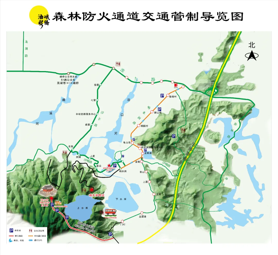 (一)当响水涧路车辆饱和时,该路段实行单向通行(响水涧路与淮九路交叉口驶入,向响水涧景区游客中心方向行驶),严禁逆行。车辆可经龙马路→淮林路或浮峨路→浮丰路驶出响水涧景区;