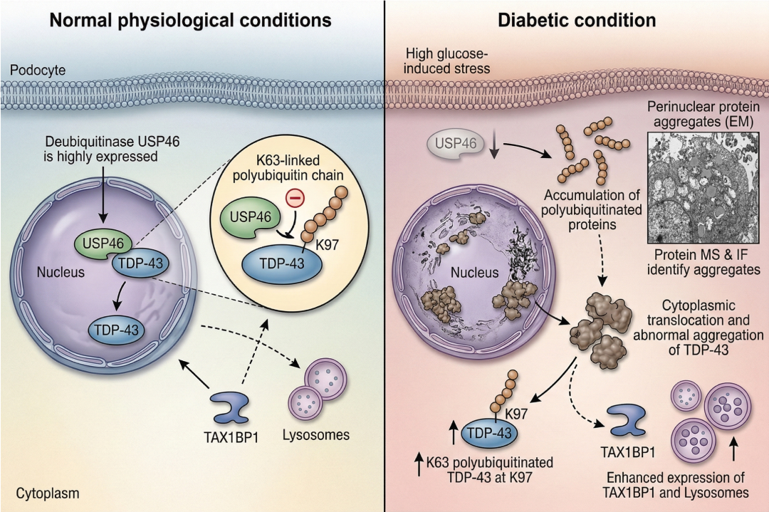 体外研究发现,在足细胞中敲低 USP46 后,细胞内泛素修饰蛋白大量堆积,核周区域可见显著的蛋白聚集体形成。通过蛋白质谱与免疫荧光鉴定,进一步明确了这些聚集体主要为 TDP-43 蛋白。值得注意的是,这一病理特征同样在糖尿病小鼠模型及 DN 患者肾组织足细胞中被观察到,提示糖尿病状态下的足细胞损伤可能具有与神经退行性疾病类似的毒性蛋白质病(Proteinopathy)特征。进一步机制研究显示,在正常生理条件下,TDP-43 主要定位于足细胞核内。而在 USP46 缺失或高糖环境下,TDP-43 发生明显的胞质异常转位与聚集,并伴随自噬相关蛋白 TAX1BP1 及溶酶体表达的上调。过表达 USP46 则可显著抑制高糖诱导的 TDP-43 胞质异常定位与聚集,并恢复 TAX1BP1 及溶酶体的正常表达水平。通过点突变实验,研究团队证实 USP46 与 TDP-43 存在相互作用,在特异性地去除 TDP-43 第 97 位赖氨酸位点上的 K63 连接型多聚泛素化链后,可以维持 TDP-43 在足细胞中的正常核定位。这一发现揭示了 USP46 在维持足细胞蛋白稳态中的关键作用,并为 DN 治疗提供了潜在新靶点。