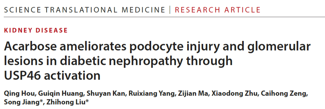 2026 年 3 月 12 日,东部战区总医院国家肾脏疾病临床医学研究中心刘志红院士、蒋松主任医师作为共同通讯作者(侯庆副研究员为论文第一作者),在 Science 子刊 Science Translational Medicine 上发表了题为:Acarbose ameliorates podocyte injury and glomerular lesions in diabetic nephropathy through USP46 activation 的研究论文。