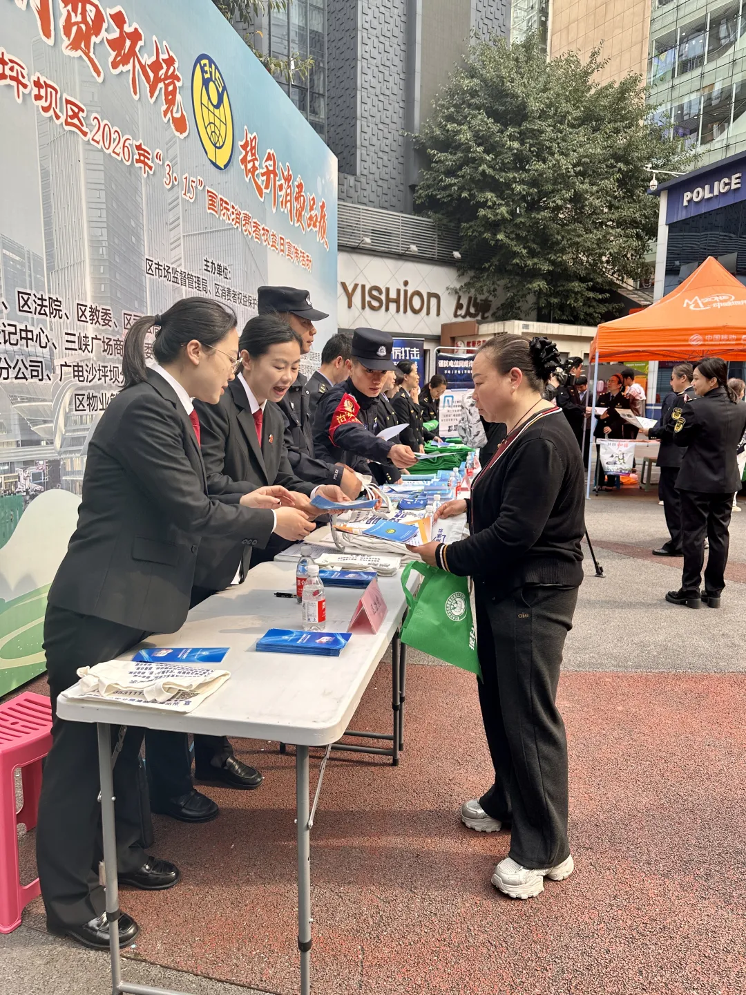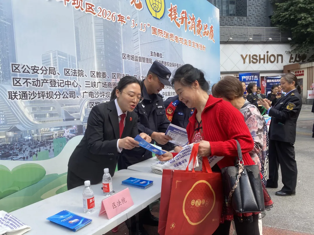 3月13日,在第44个“3.15”国际消费者权益日来临之际,沙坪坝法院联合区市场监督管理局、区消费者权益保护委员会等,在沙坪坝区文化馆广场开展了一场以“优化消费环境,提升消费品质”为主题的消费者权益保护普法宣传活动。