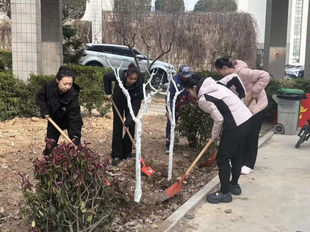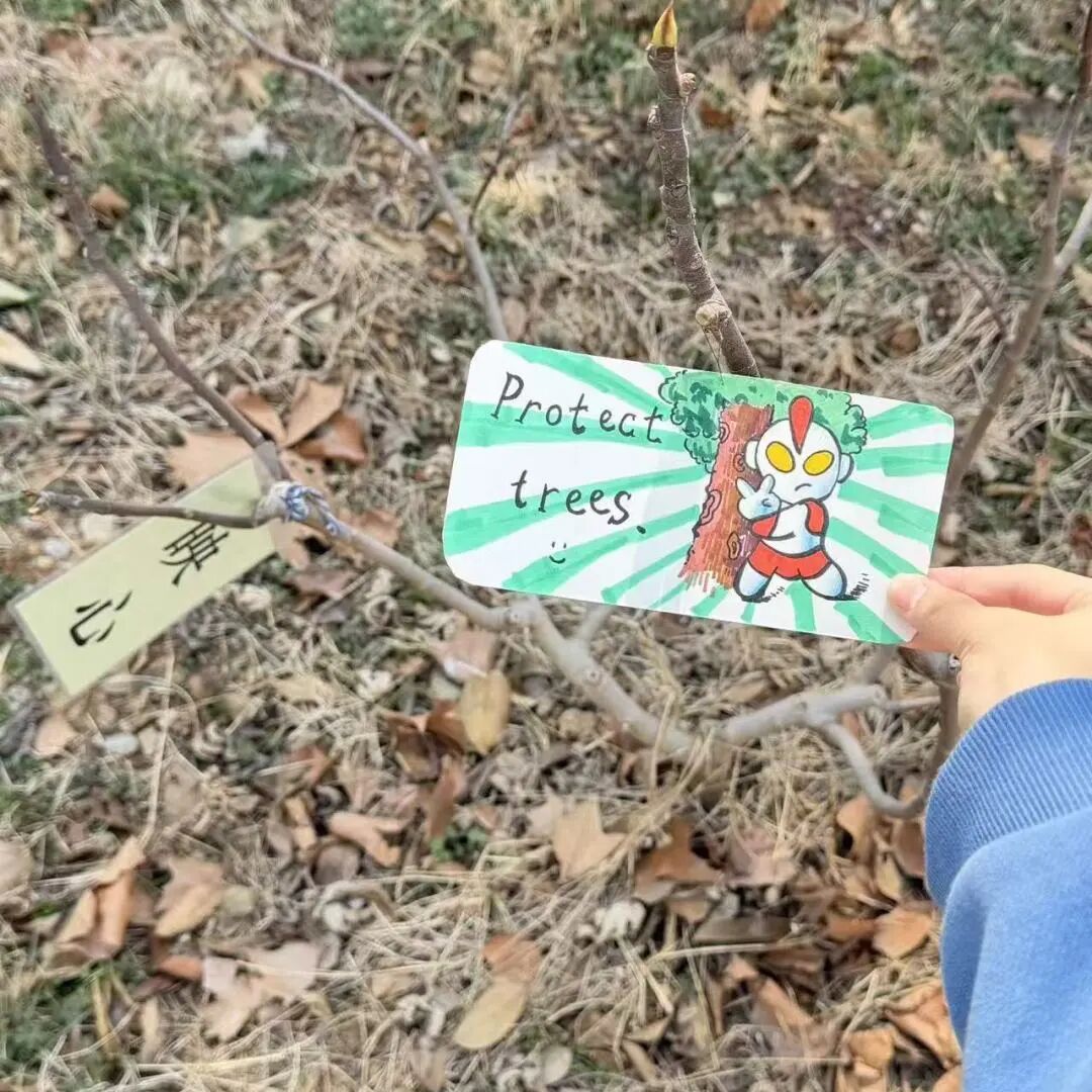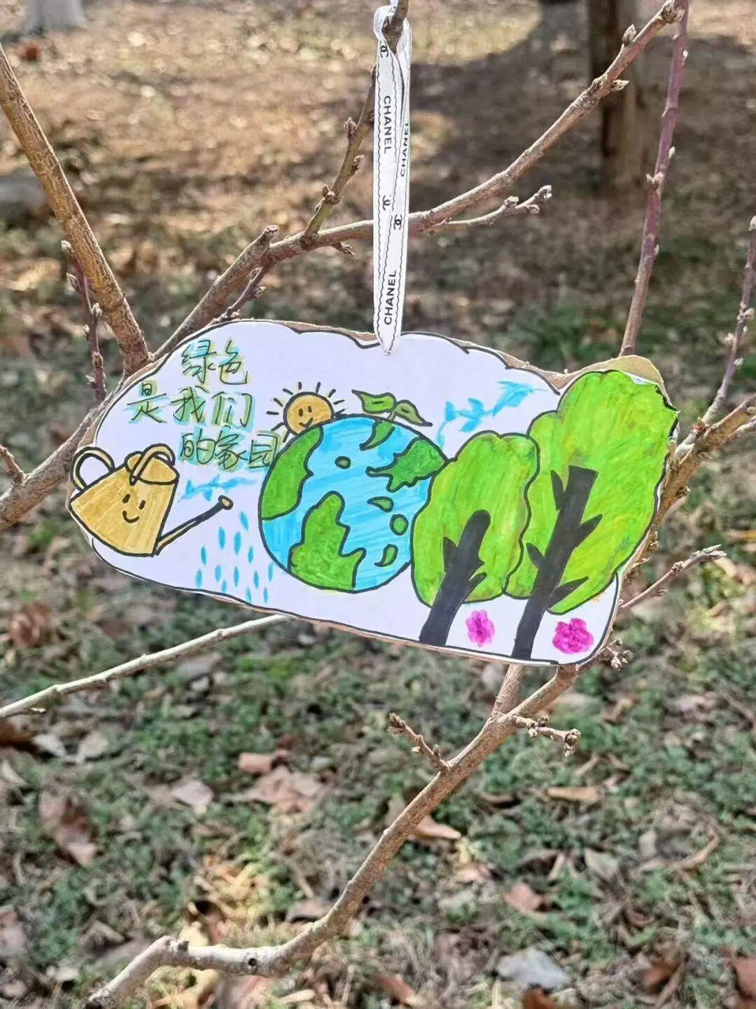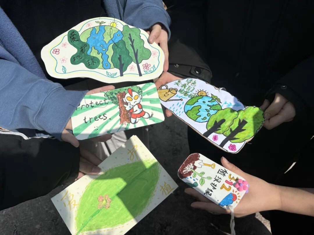 活动现场,同学们热情高涨,分工协作。从挥锹挖坑、扶正树苗,到培土夯实、提水浇灌,每一个步骤都一丝不苟。汗水挥洒间,一株株新苗稳稳扎根沃土,迎风挺立,为春日的校园增添了一片生机勃勃的新绿。植树完成后,同学们充分发挥艺术才华,精心设计并绘制了创意树牌。树牌内容既有“爱护地球”的质朴心声,也有中英文的环保标语,更巧妙融入了飘逸的舞蹈线条与形体元素,将生命律动与自然之美凝于方寸之间。这些独特的树牌悬挂于枝头,既是温馨的环保提示,也是校园里一道生动的美育风景线。