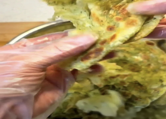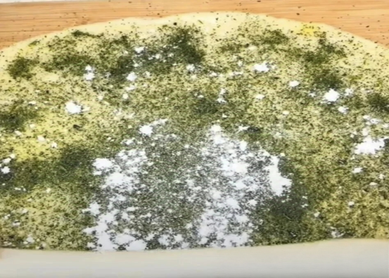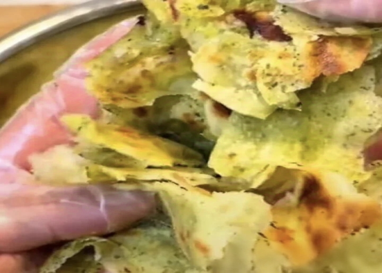 醒好的面团再揉上一揉,搓成圆润的大面团,用擀面杖擀成三四毫米厚的薄饼。此时便是赋予风味的关键一步,淋上清亮的胡麻油,用手细细涂抹均匀,再撒上满满的苦豆叶沫(也叫香豆),那独特的辛香瞬间散开,钻进鼻尖。紧接着将抹好油与香料的面饼从头卷起,卷成一根紧实的长面棒,菜刀起落间,切成大小均匀的小剂子,每个剂子再擀成四五毫米厚、十五到二十厘米见方的圆饼,一个个饱满的饼胚便做好了。