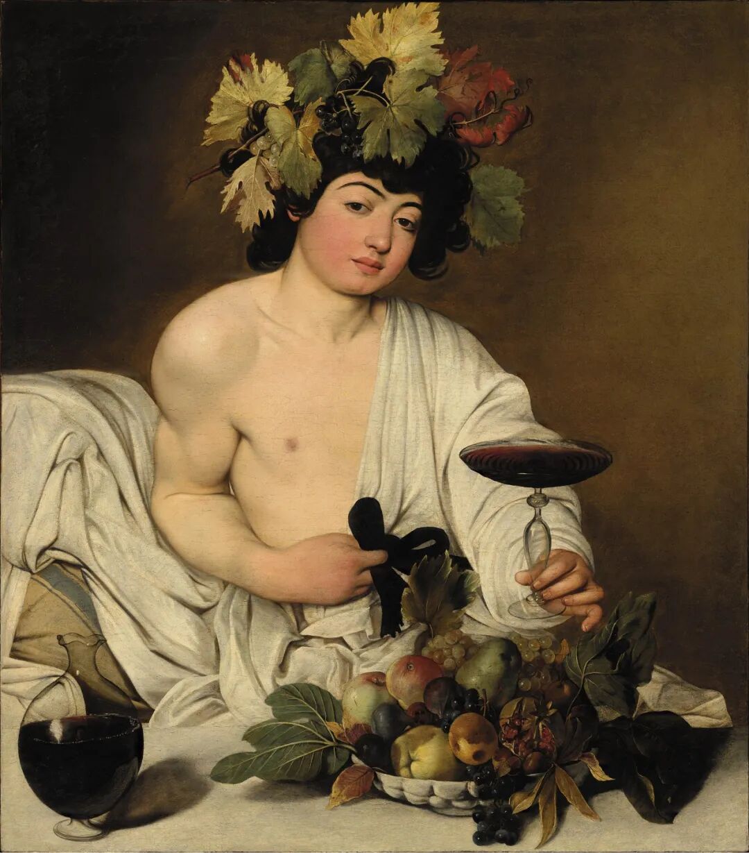 尼采这样形容日神阿波罗“他那种适度的自制......充满智慧的宁静,他的眼睛必须是太阳般的发光,即便在流露愤怒而不满的眼神时,也依然沐浴在美的假象的庄严之中”;酒神则相反,画面中,巴克斯与一群狂欢者置身于一个充满生机与活力的自然环境中,他们或举杯共饮,或翩翩起舞,沉浸在一片爱的温馨与狂欢的喜悦里,人物形象大胆而放荡,色彩丰富多变,气氛热烈。这幅作品基本表达了酒神崇拜的表现方式。酒就像一种有魔法的药水,把人带入一种冲破藩篱的境地,“魔术师”用的好,它能从人心灵深处升起一种狂喜的陶醉,唤醒人们被封印的天赋,给人无尽的欢乐。中国没有明确的酒神,也没有酒神节,但并不妨碍酒依然是我们的好朋友。