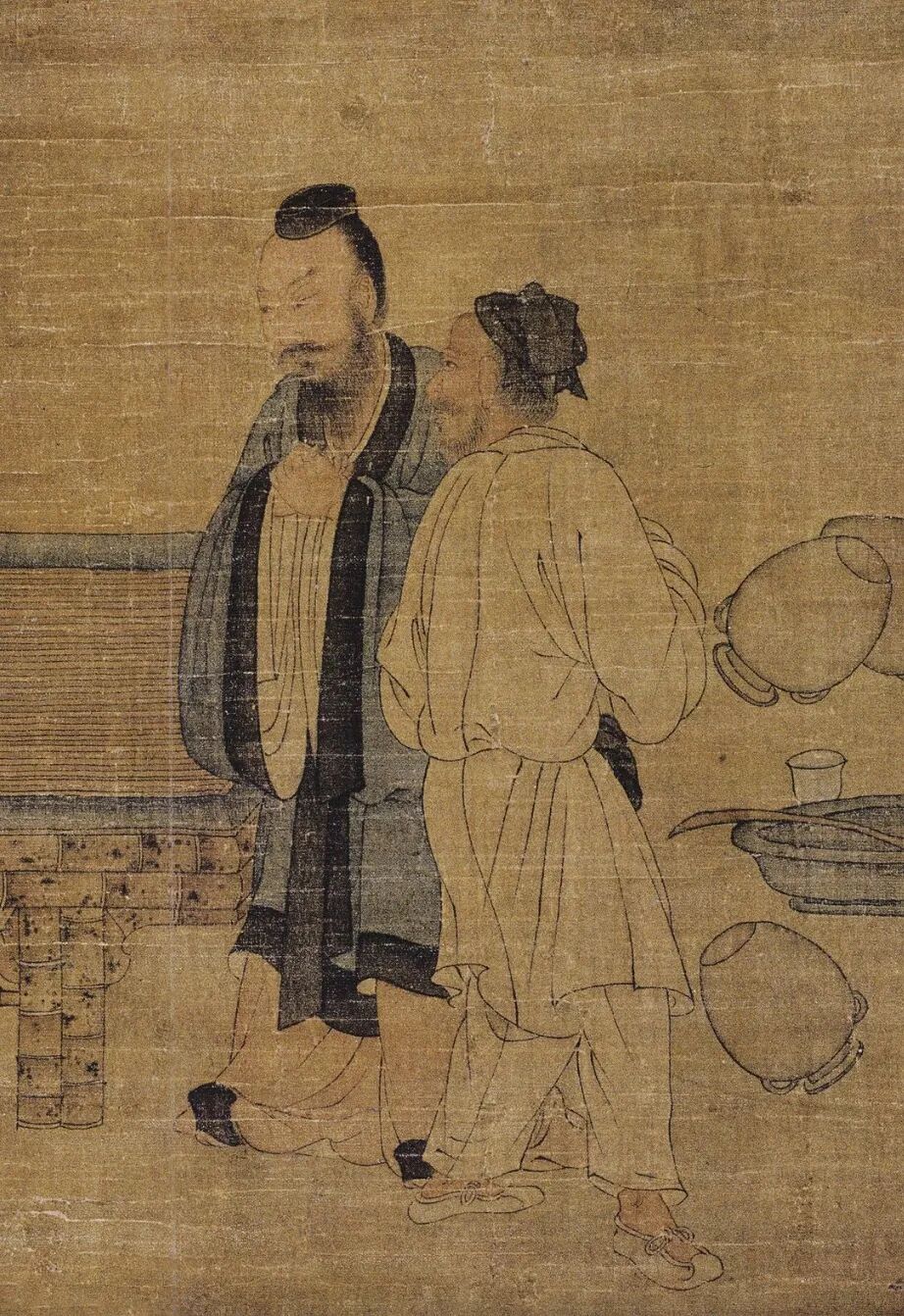 那么,醉酒的程度成为历代文人琢磨的关键点。元代全能艺人钱选(字舜举,号玉潭)领悟到了这个最佳时机:“酒不醉不能画,绝醉亦不可画”,是介于清醒与烂醉之间的一种状态。钱选不仅爱喝酒还画爱喝酒的人。《扶醉图》乍一看以为是三五知己烹泉煮茗的雅集图,实则非也。只见主人公陶渊明一手扶榻,双腿交叉,后脚轻微踮起,将坐未坐的状态,颇有“弱柳扶风”之姿。他衣襟大开,左手轻抬,两眼皮渐重不支看向手指的方向——恭谨作揖的客人,其衣着与陶渊明类似,但他那交叉的双手、微低的头、略分开的脚,其动势都往内聚焦,给人拘谨的印象,走势向下的衣褶似乎也透着礼法森严之感,与一旁的松弛感形成强烈反差。反观身边那白衣老仆,也在有意请示客人离开,深得主人心。