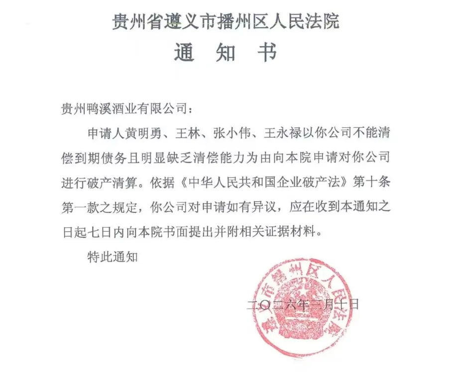 据“微酒”3月15日消息,贵州省遵义市播州区人民法院于3月10日下发的通知书显示,贵州鸭溪窖酒厂因“不能清偿到期债务且明显缺乏清偿能力”,被黄明勇、王林、张小伟、王永禄等四名员工向法院申请进行破产清算。
