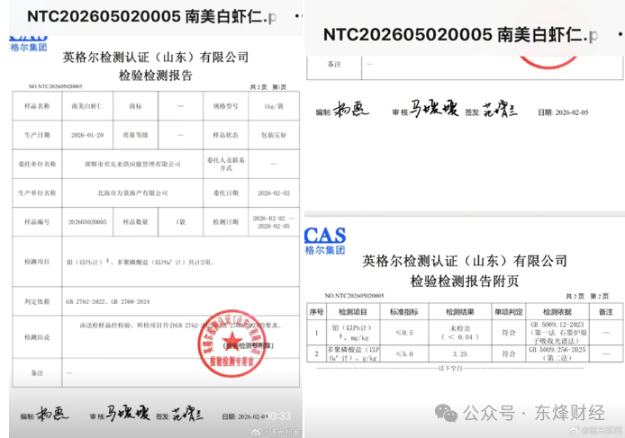 据陕西科技报逐光新闻等媒体报道,反诈老陈当时还出具了由英格尔检测认证(山东)有限公司出具的检测报告,显示其质疑的与辉同行涉事产品是由北海市万景海产有限公司生产的南美白虾仁,该产品中检出多聚磷酸盐,也就是保水剂。