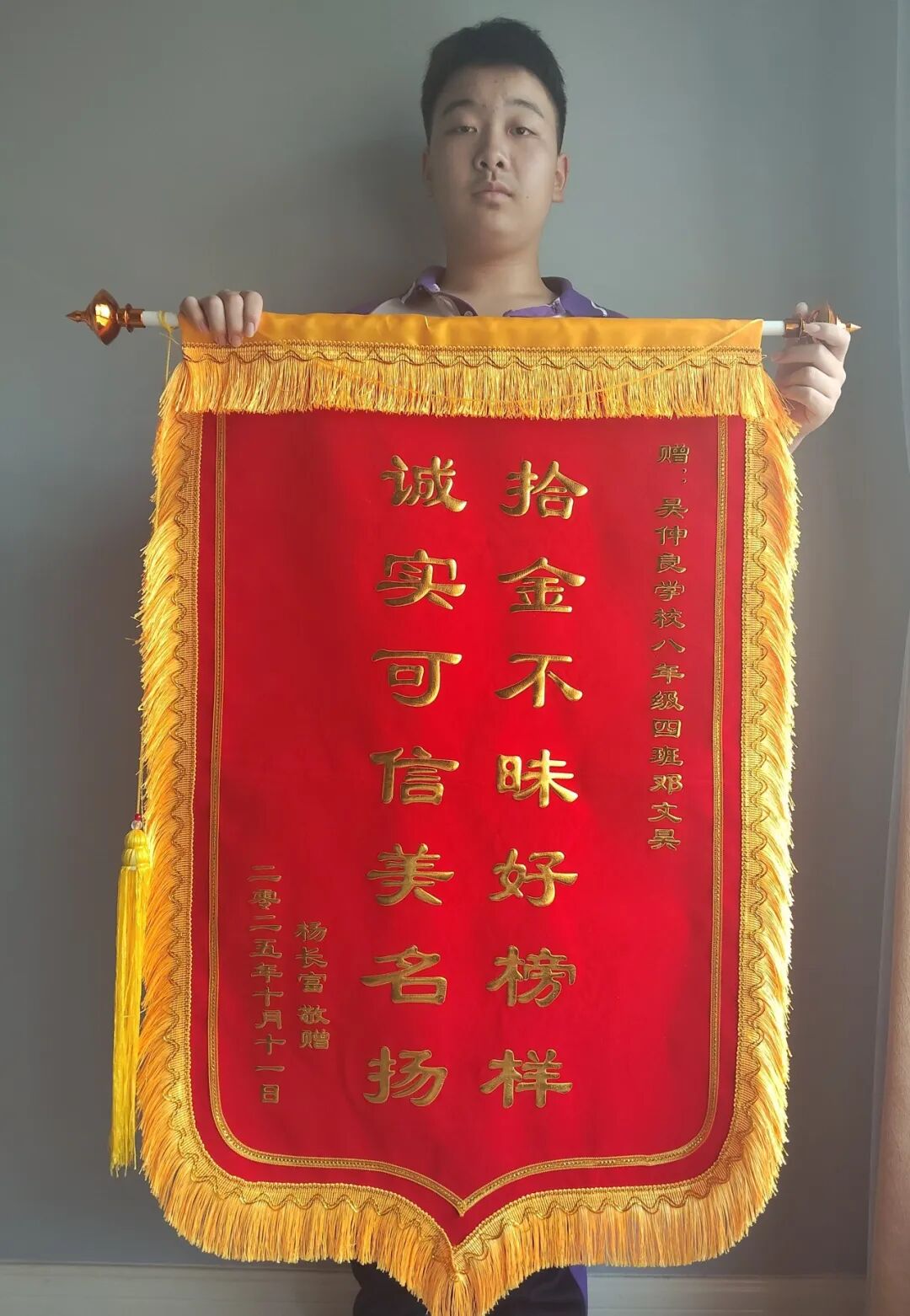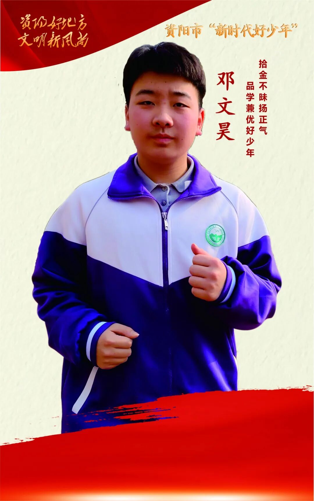 一捆散落的现金,是对人性的考验;一次坚定的归还,是品格的彰显。邓文昊以少年之肩,扛起了诚信的重量;以平凡之举,树立了新时代少年的精神标杆,是资阳这座“有爱之城”里,最闪亮、最动人的青春坐标。