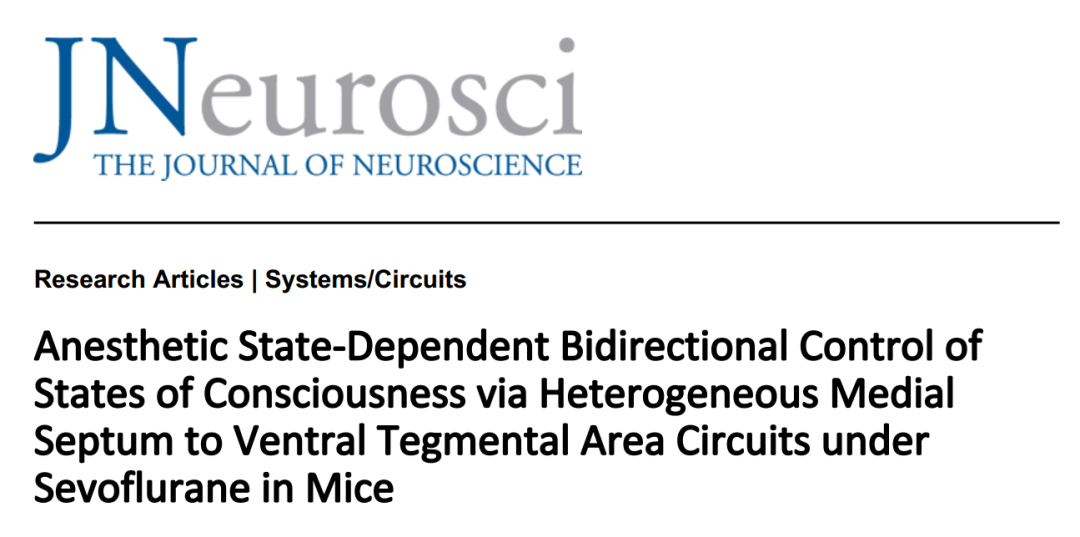 2026年3月6日,华中科技大学同济医学院附属同济医院梅伟、唐洲平团队在《The Journal of Neuroscience》上发表的研究《Anesthetic State-Dependent Bidirectional Control of States of Consciousness via Heterogeneous Medial Septum to Ventral Tegmental Area Circuits under Sevoflurane in Mice 》,找到了这个关键开关: