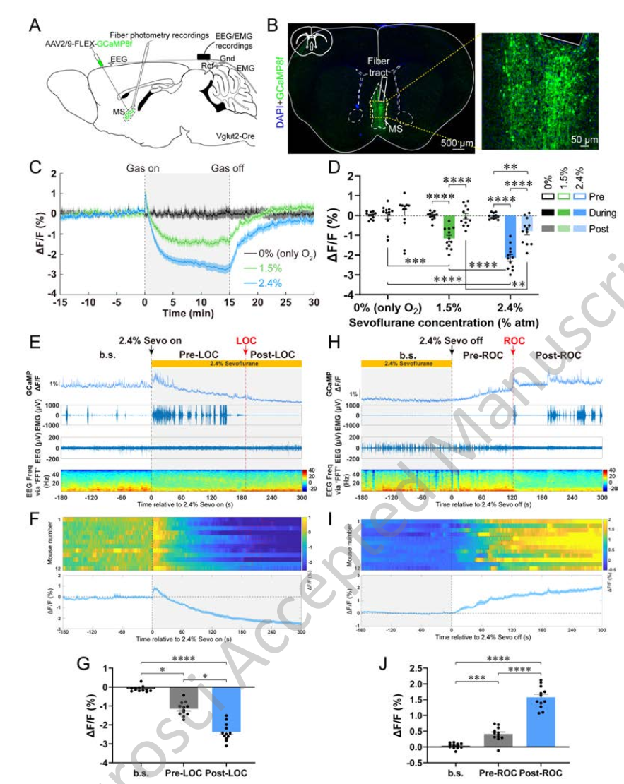 首先,研究者聚焦内侧隔核(MS)脑区,用光纤光度法记录谷氨酸能神经元的活动,发现:随着七氟烷浓度升高,这些神经元的活性逐渐降低;麻醉变浅时,它们的活性又逐渐恢复——和意识状态完全同步。