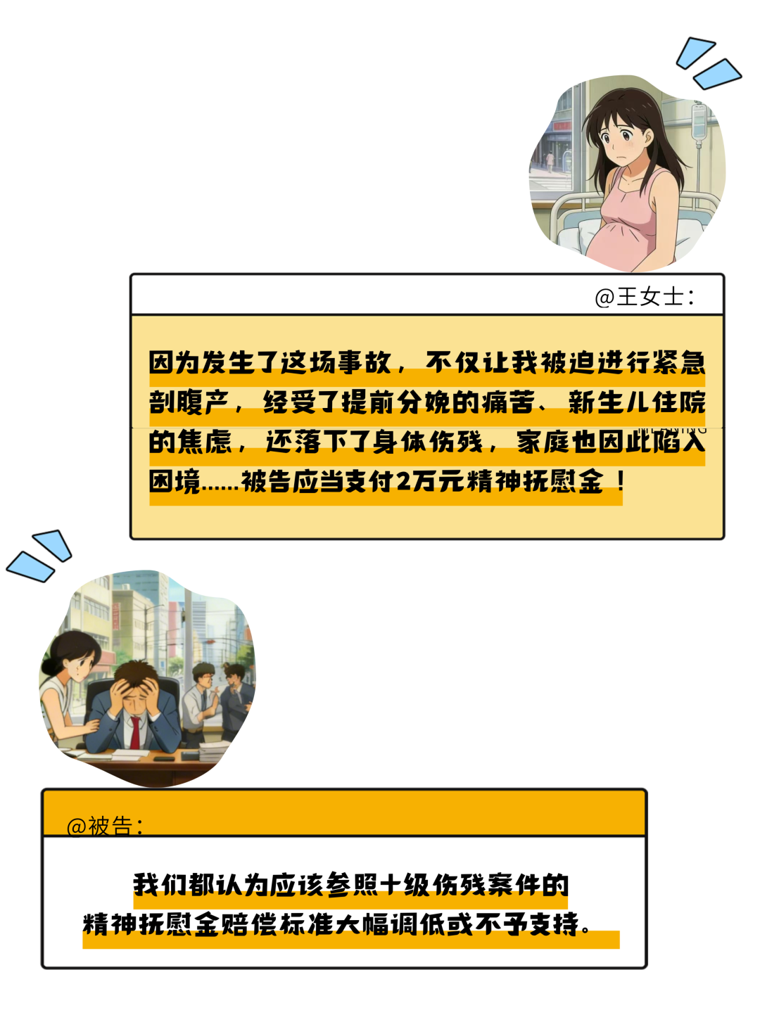 本案中,事故导致王女士锁骨骨折,此为直接身体伤害,但事故同时引发了孕妇王女士提前剖腹产的生理风险与对胎儿健康情况产生的心理恐惧,这是普通伤残案件中不存在的精神压力。