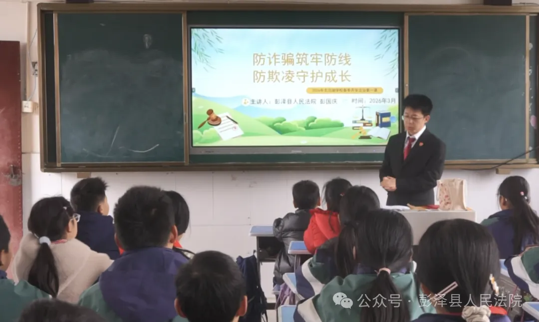 春风为序,法治启新。为增强未成年人法治意识,筑牢防诈防欺凌安全屏障,彭泽县人民法院法治副校长走进太泊湖学校,开展以“防诈骗筑牢防线,防欺凌守护成长”为主题的春季开学法治第一课。