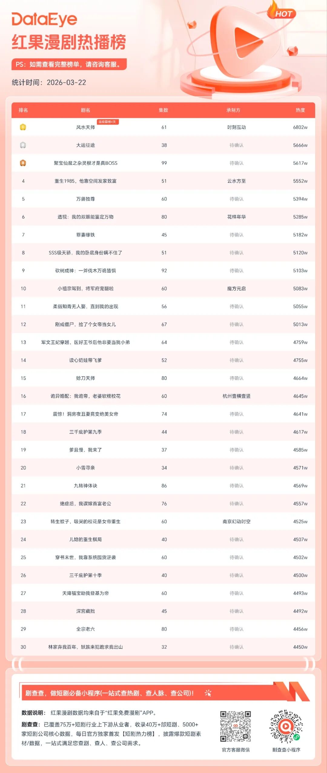 3月22日,DataEye短剧&漫剧榜单发布。漫剧方面,包括红果漫剧榜、抖音热播榜(综合)以及细分的抖音沙雕漫榜、抖音真人AI榜;真人剧方面,包括微短剧热力榜、红果热榜、抖音端原生热播榜,共计7大榜单合集如下。