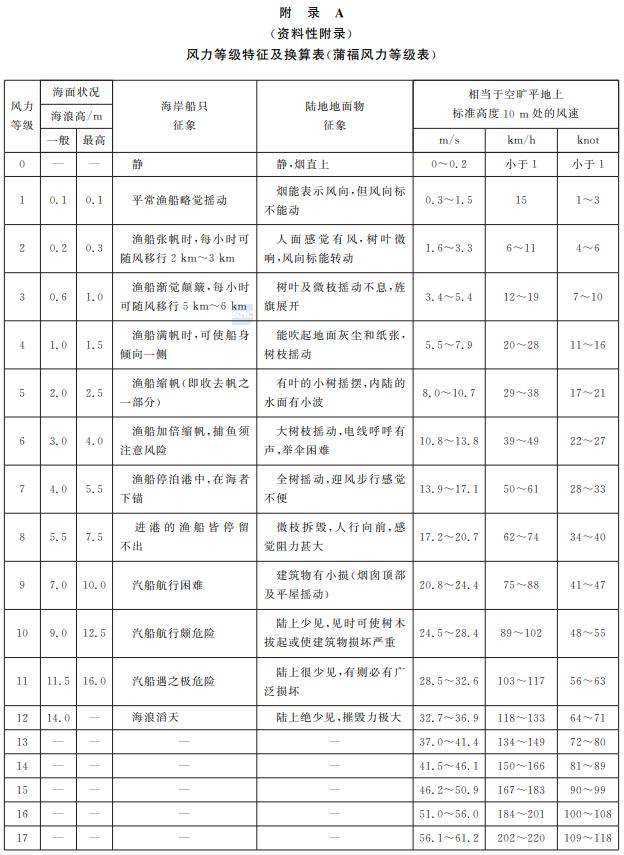 注:蒲福风级是由英国人蒲福(FrancisBeaufort,1774—1857)于1805年拟定的,并于1946年又作了扩充。蒲福风力等级参见附录A。