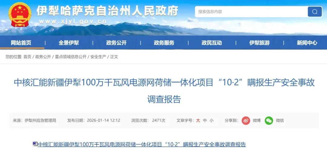 今年1月14日,新疆维吾尔自治区伊犁哈萨克自治州人民政府网站公布了一起事故调查报告《中核汇能新疆伊犁100万千瓦风电源网荷储一体化项目“10·2”瞒报生产安全事故调查报告》。