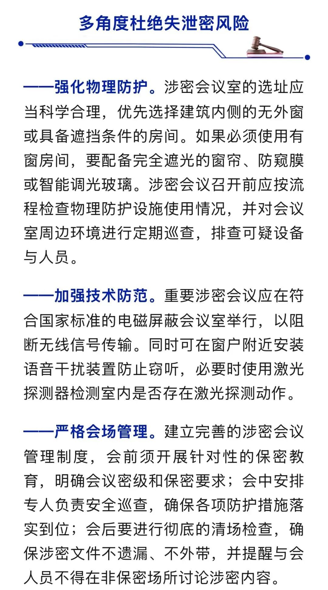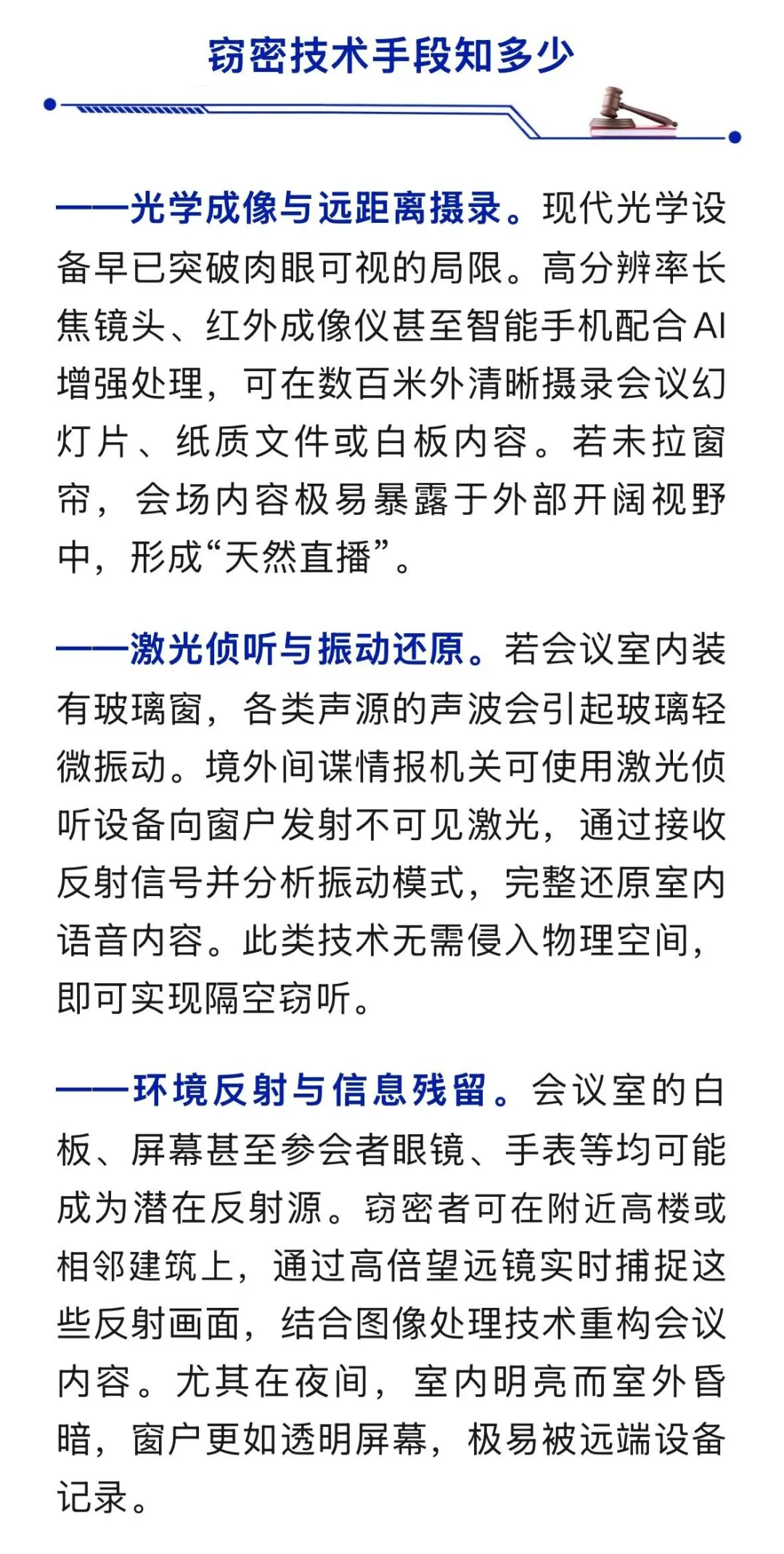 国家安全机关提示:涉密会场,堪称国家秘密安全防线的前沿阵地,任何细节疏忽都可能导致阵地失守。有关单位和公民应自觉提高防范意识,履行保密安全义务,做好日常防护。如发现涉密会议内容被窃取等可疑线索,可通过12339国家安全机关举报受理电话、网络举报受理平台(www.12339.gov.cn)、国家安全部微信公众号举报受理渠道或者直接向当地国家安全机关进行举报。