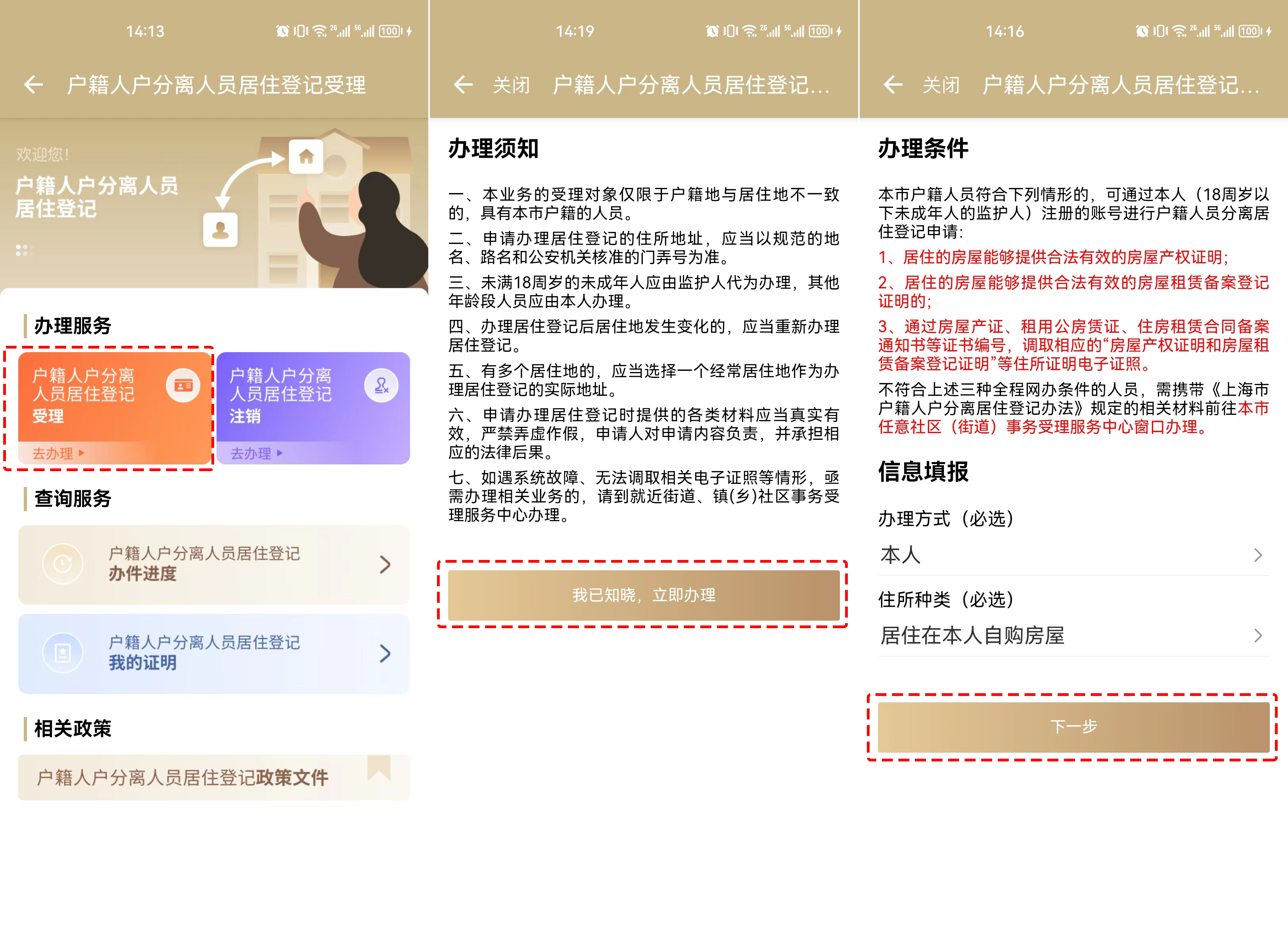 点击“户籍人户分离人员居住登记受理”→查看办理须知,点击“我已知晓,立即受理”→信息填报处,确认办理方式和住所种类后,点击“下一步”;