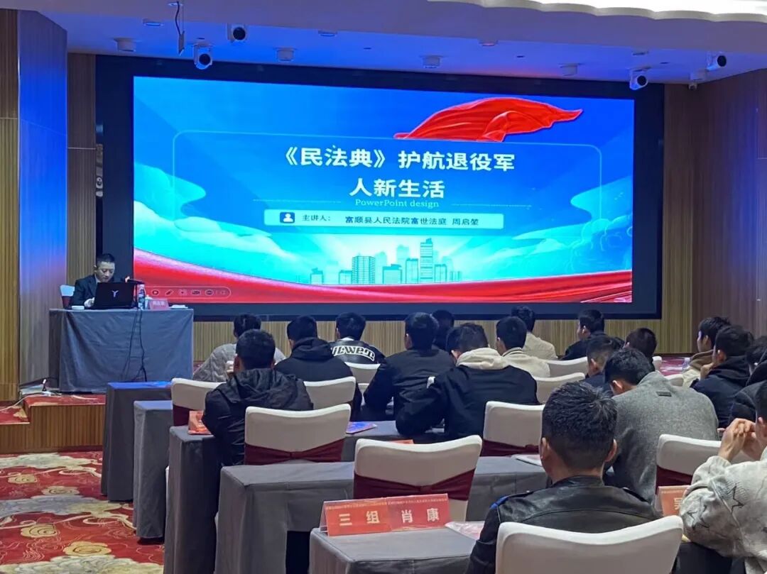 为切实提升退役军人法治意识与依法维权能力,筑牢退役军人权益司法保护坚实屏障,近日,富顺县法院富世法庭周启堃法官受邀前往四川福源灏研学教育基地,开展“《民法典》护航退役军人新生活”专题法治宣讲,为在场退役军人送上了干货满满、实用性极强的法律知识盛宴。