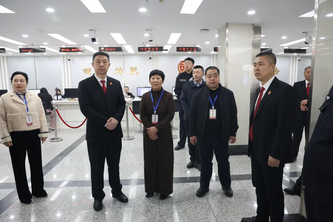 调研组一行先后实地察看法院诉讼服务中心、多元解纷中心、羁押室、刑事审判庭等场所,通过听取专项报告,查阅卷宗、座谈交流等方式,详细了解了刑事案件从立案到审理的流程,听取了关于司法便民举措、多元解纷机制、智慧法院建设、队伍建设等有关情况的介绍。