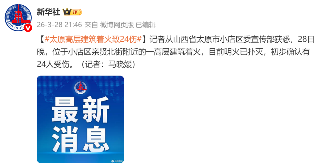 原标题:《太原一高层建筑发生火灾,已致1人死亡25人受伤,现场明火已扑灭,救援正在进行;附近商家:消防人员来得很快,已经看不到火星子了》