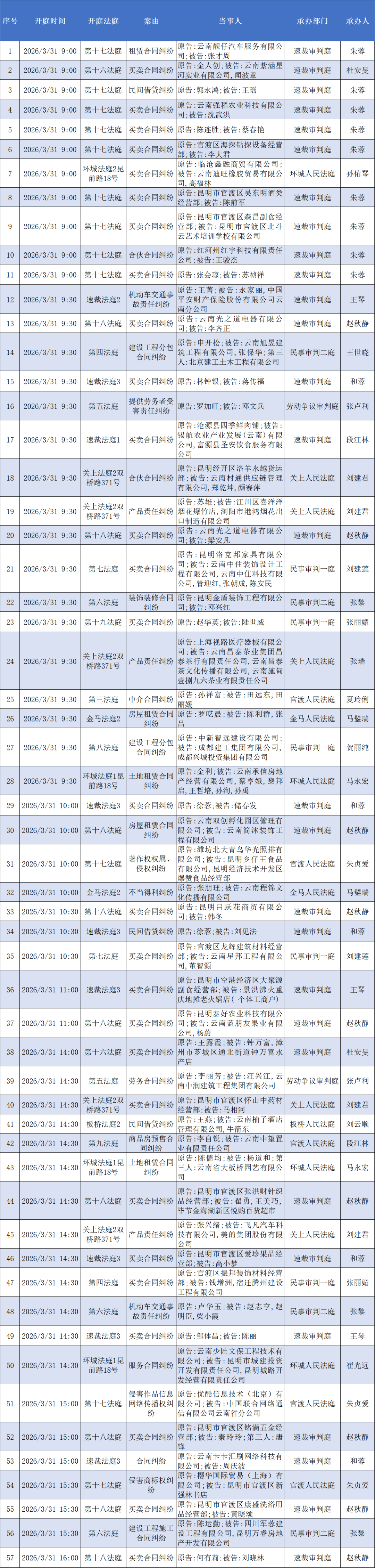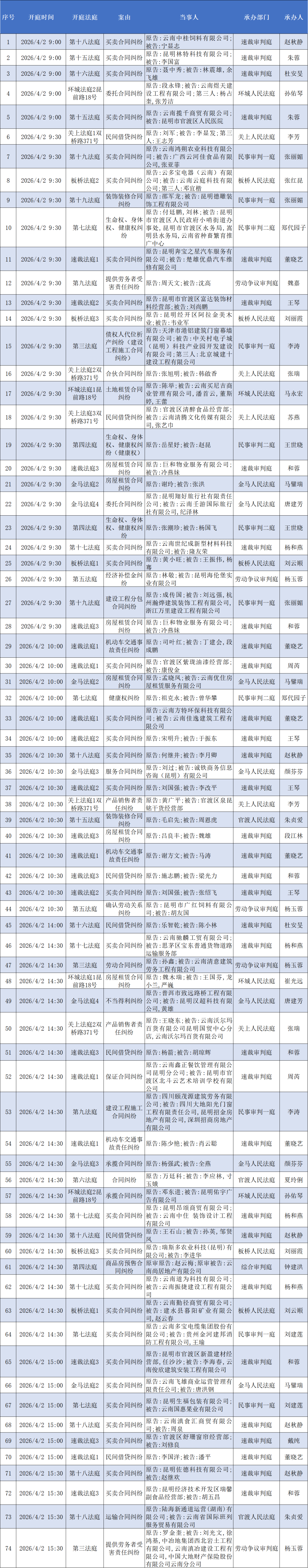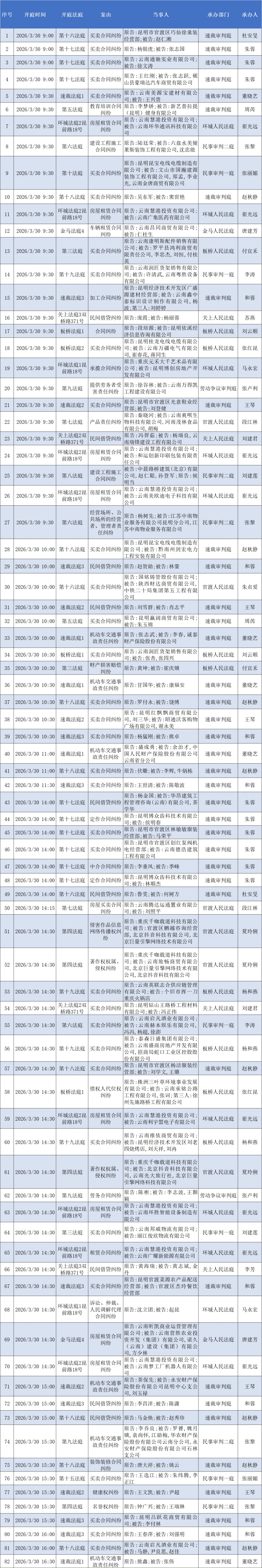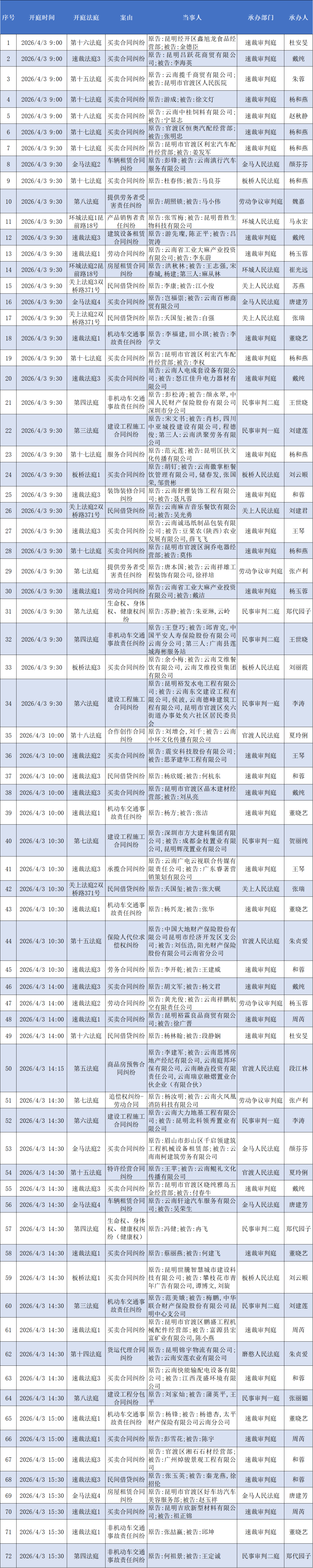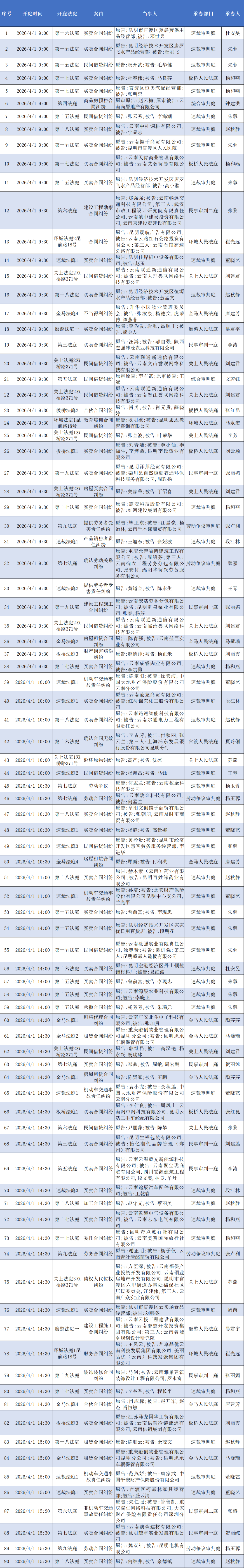 【开庭公告】官渡法院开庭排期表(2026.3.30—2026.4.3)