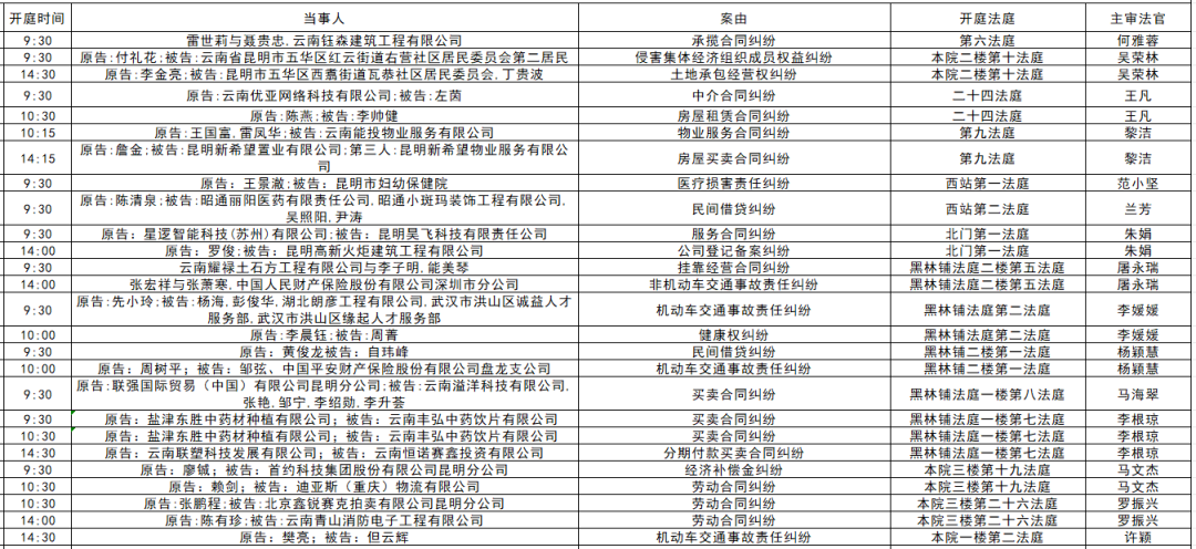 五华区人民法院每周开庭安排(2026年3月30日—4月3日)