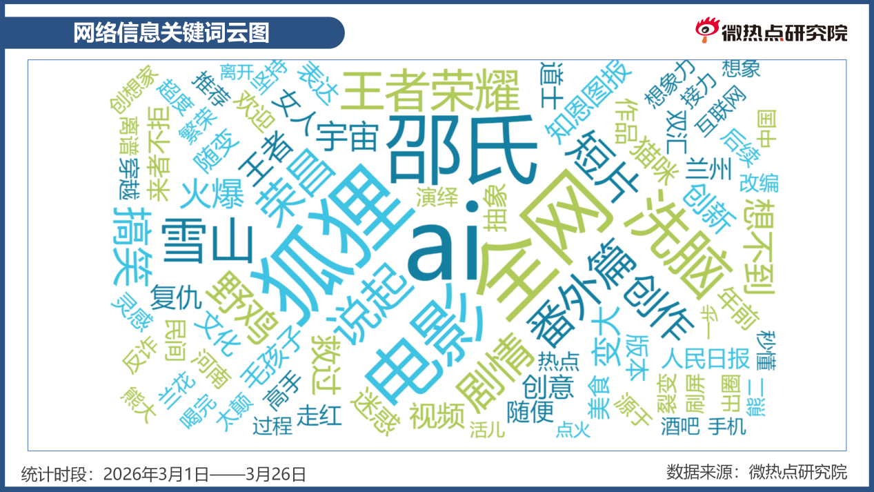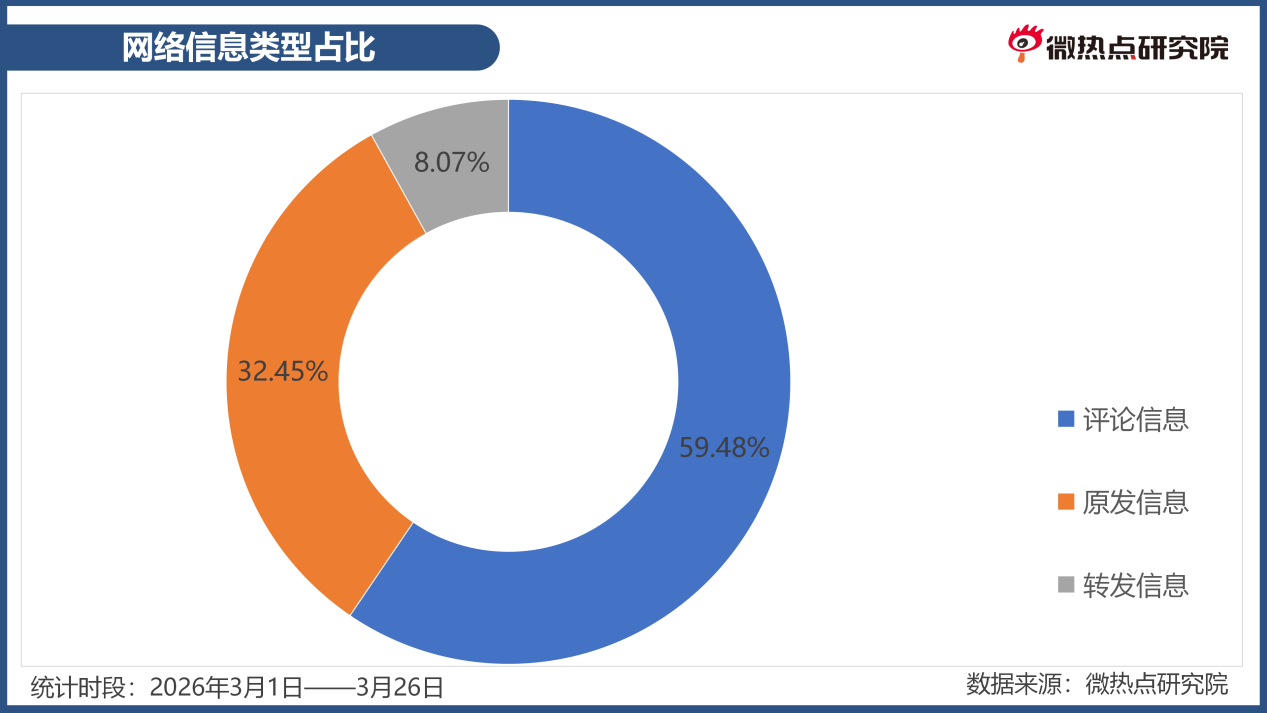 微热点研究院统计数据显示,3月1日至26日,全网相关信息量23.69万条,其中,评论信息14.1万条,占比59.48%,表明《雪山救狐狸》引发网民较高讨论和关注。