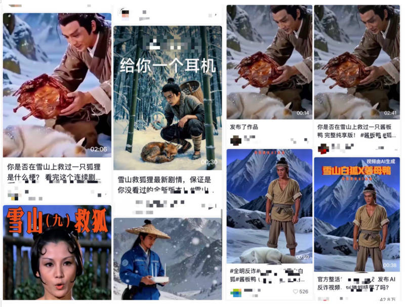 近期,这句带着荒诞感的台词,连同AI生成的画面,从短视频平台蔓延到全网,内容从“酱板鸭复仇”到“雪山、豆汁、细菌”的接龙式替换,版本从邵氏武侠风衍生出了好莱坞、印度风等版本,二创作者从普通网民到官方机构账号,参与群体不断扩大,“雪山救狐”成为百度百科标注的网络流行词,人民日报刊发评论《创新的社会,欢迎“脑洞大开”》。没有明星加持、没有专业宣发、没有大制作团队,仅凭几句魔性台词和AI生成的复古画面,《雪山救狐狸》系列短片彻底火爆全网。