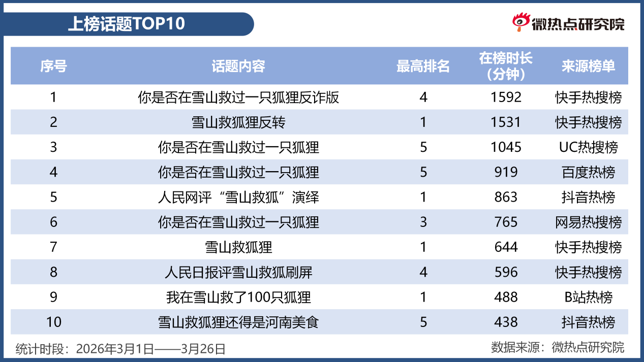 3月1日至26日,62个相关话题登上各大平台热榜。“雪山救狐狸反转”“‘雪山救狐’为何引发全民创作热潮”“雪山救狐狸系列已经发展成这样了”等10个话题排名抖音热榜、快手热搜榜、B站热榜等热榜第一。“雪山救狐狸政务版”“你是否在雪山救过一只狐狸反诈版”“雪山救狐狸的风吹到了南部空军”等7个话题在榜时长超一千分钟,其中,话题“你是否在雪山救过一只狐狸真人版”在榜时长达4872分钟,表明相关话题获得网民持续关注和讨论。