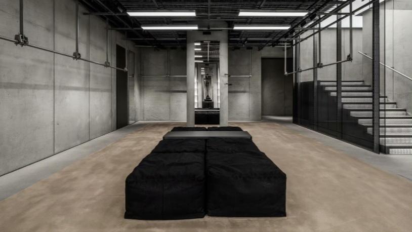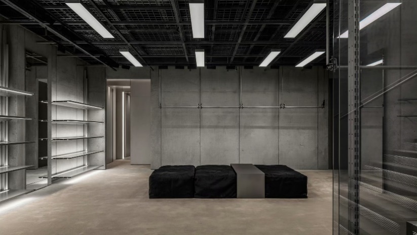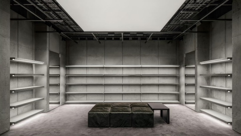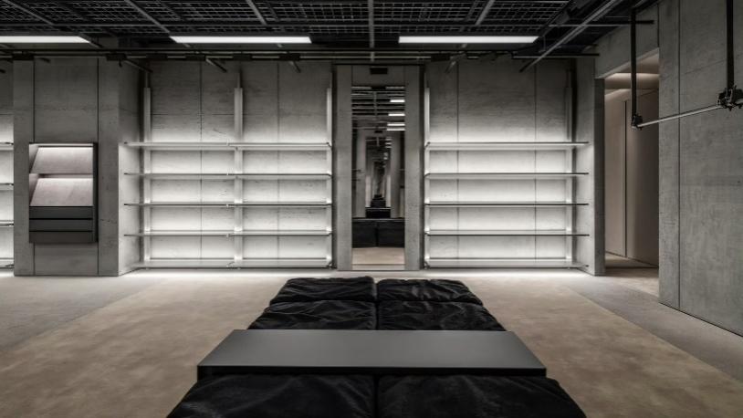 店铺设计承袭巴黎世家标志性的原始建筑风格(Raw Architecture)理念,以未经雕琢的原生空间质感,与周边高档购物场所中常见精致光洁的外立面形成强烈视觉反差。面向商场中庭的超高清数字大屏,实时展示当季风尚,将品牌的现代美学内核与店内的解构主义设计语言完美相融:刻意做旧的斑驳混凝土立柱、管线外露的网格吊顶,以及复刻了城市高频通行人行步道质感的地面。