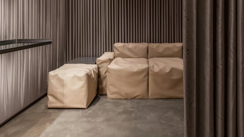 背光台阶与艺术装置为通道增添暗黑戏剧氛围,大型天窗式顶灯与背光面板在多个空间内散发柔和漫射光线——包括配备了软质方形沙发、通体被垂帘、地毯柔软包裹的全高式试衣间。为庆祝此次升级启幕,店内特别以广州樱花枝作为点缀装饰。