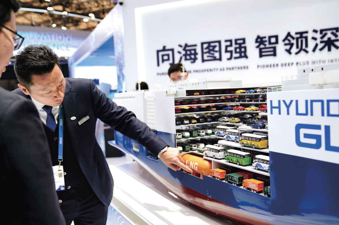 >>2025年12月2日,在中国国际海事会展上,参展商介绍汽车运输船内部情况。 新华社记者 张建松/摄