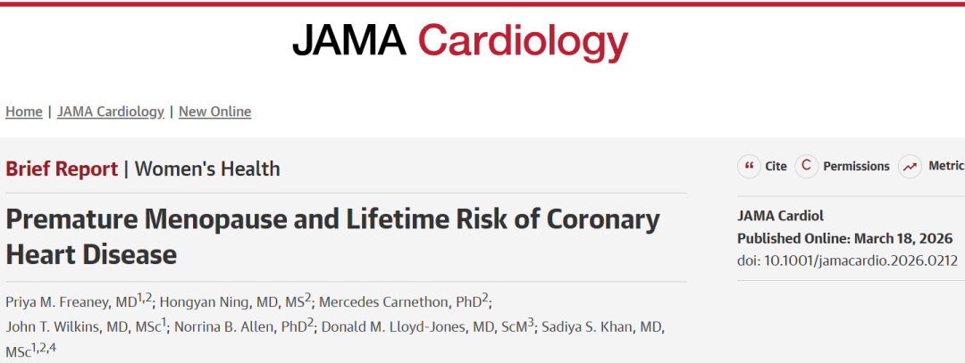 [1] Freaney PM, Ning H, Carnethon M, et al. Premature Menopause and Lifetime Risk of Coronary Heart Disease. JAMA Cardiol. Published online March 18, 2026. doi:10.1001/jamacardio.2026.0212