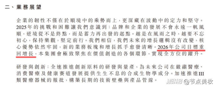 面对这一局面,巨子生物在年报中明确提出“2026年公司目标重回增长”。在业绩电话会上,公司进一步强调了“双美战略”,更强调要实现护肤与医美协同发展。