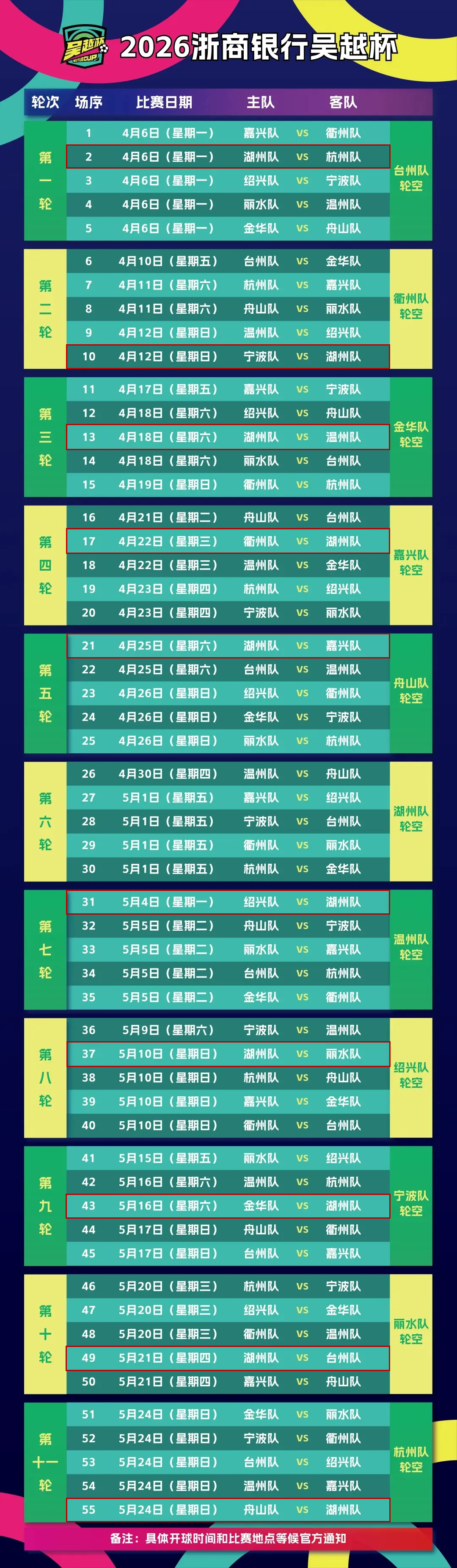吴越杯全赛程来了!4月6日,看湖州!
