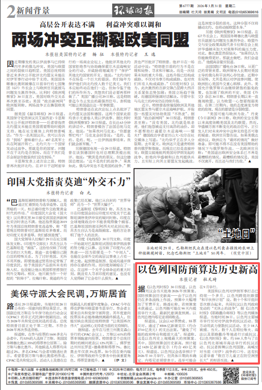 据《以色列时报》3月30日报道,以色列议会当天批准2026年预算案,国防预算创历史新高——由于以色列仍在多条战线上作战,预算中大幅增加了军费开支。路透社称,若预算案未获通过,以色列极可能在90天内提前举行大选。最新民意调查预测,以色列总理内塔尼亚胡将败选。