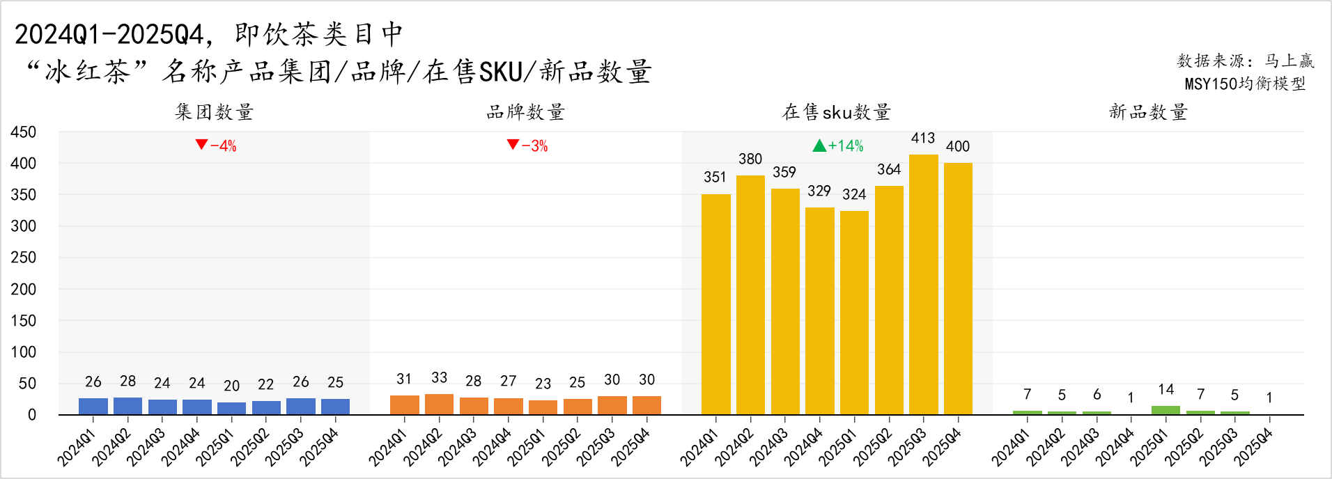 2024Q1-2025Q4,冰红茶作为传统概念饮料在集团数量与品牌数量稍有减少,分别出现4%和3%的降幅;在售SKU数量由351个增至400个,整体增幅 14%,新品投放季均为个位数,整体节奏平缓稳定。