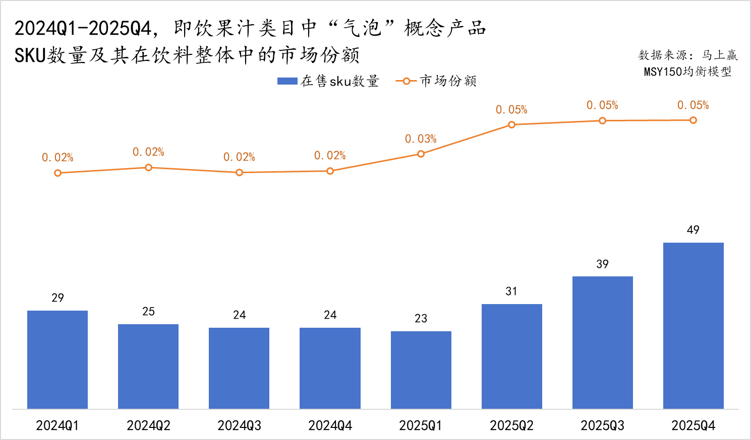 先看即饮果汁类目中的“气泡”概念产品,2024Q1-2025Q4气泡果汁的SKU数量虽在淡季有所回落,但整体仍呈增长趋势,由2024Q1的29个增长至20252025Q4的49个。而在市场份额方面,气泡果汁在饮料大类中的占比由周期初的0.02%稳步增长至周期末的0.05%,整体增长了两倍有余。SKU数量与市场份额的数据都在说明:气泡果汁正在逐步受到市场与消费者的认可,2026年的销售情况依然值得期待。