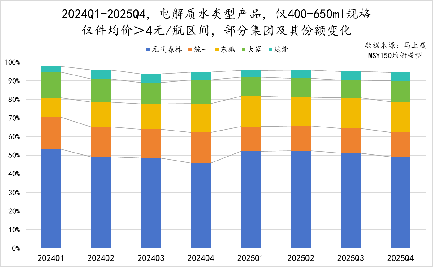 而在件均价>4元/瓶的“中高专业”价格区间,元气森林始终占据核心地位,季度份额虽有浮动但稳定在50%左右。市场份额上,元气森林与统一、东鹏、大冢、达能各分半壁江山,共同组成了电解质水类型的TOP5集团,各个集团的市场份额占比变化不大,整体均较为平稳。