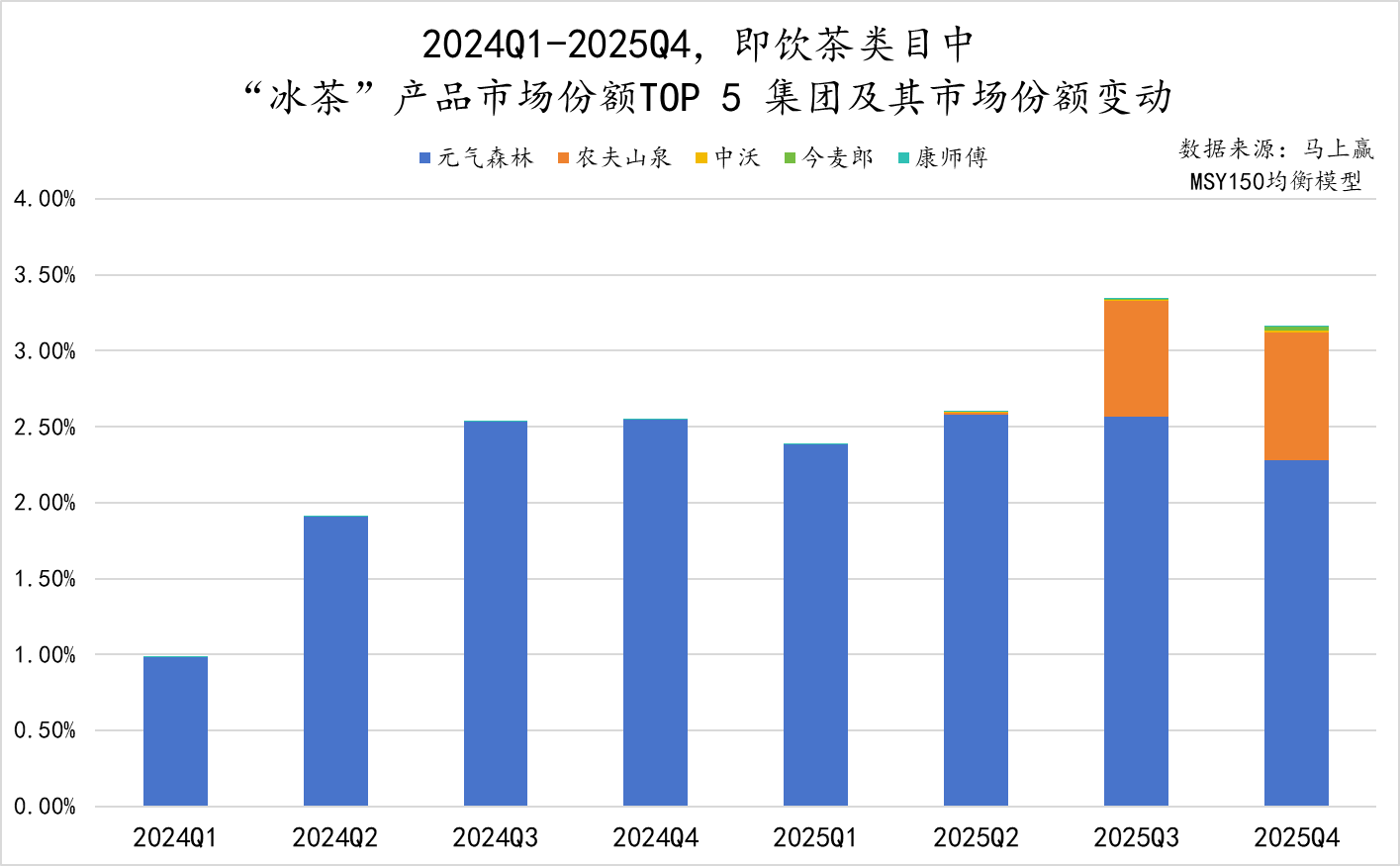 观察冰茶内部的集团市场格局,2024Q1-2025Q4,元气森林始终占据主导地位。农夫山泉在2025年宣布加入冰茶队列中后,基本未影响到元气森林冰茶的市场份额,为冰茶概念带来了新的“增量”,与元气森林冰茶共同助力冰茶市场份额超过3%。此外,中沃、今麦郎、康师傅也纷纷入场,相关产品也都在进一步成长中。