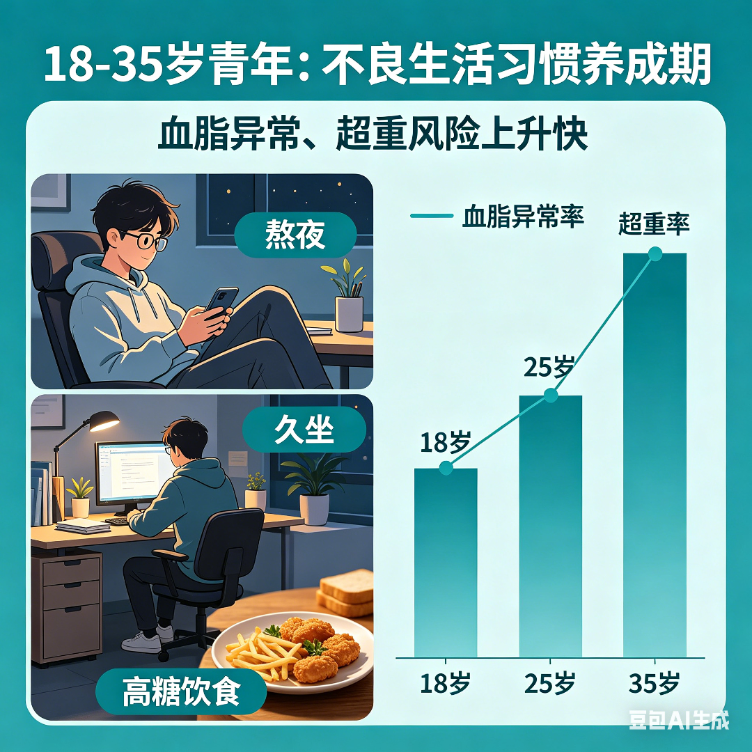 ◉ 18-35岁青年:不良生活习惯养成期,血脂异常、超重风险上升快;