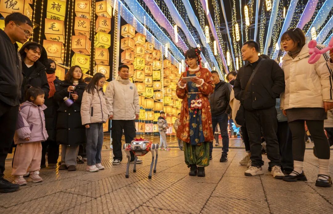 2月11日,在江西省新余市仙女湖新春灯会上,机器狗吸引了游人的目光。赵春亮摄(新华社发)