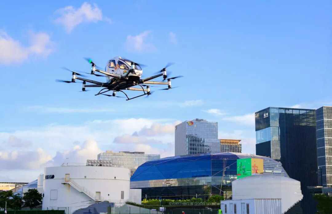 2025年7月23日,亿航智能的无人驾驶载人eVTOL在上海飞行。(新华社发)