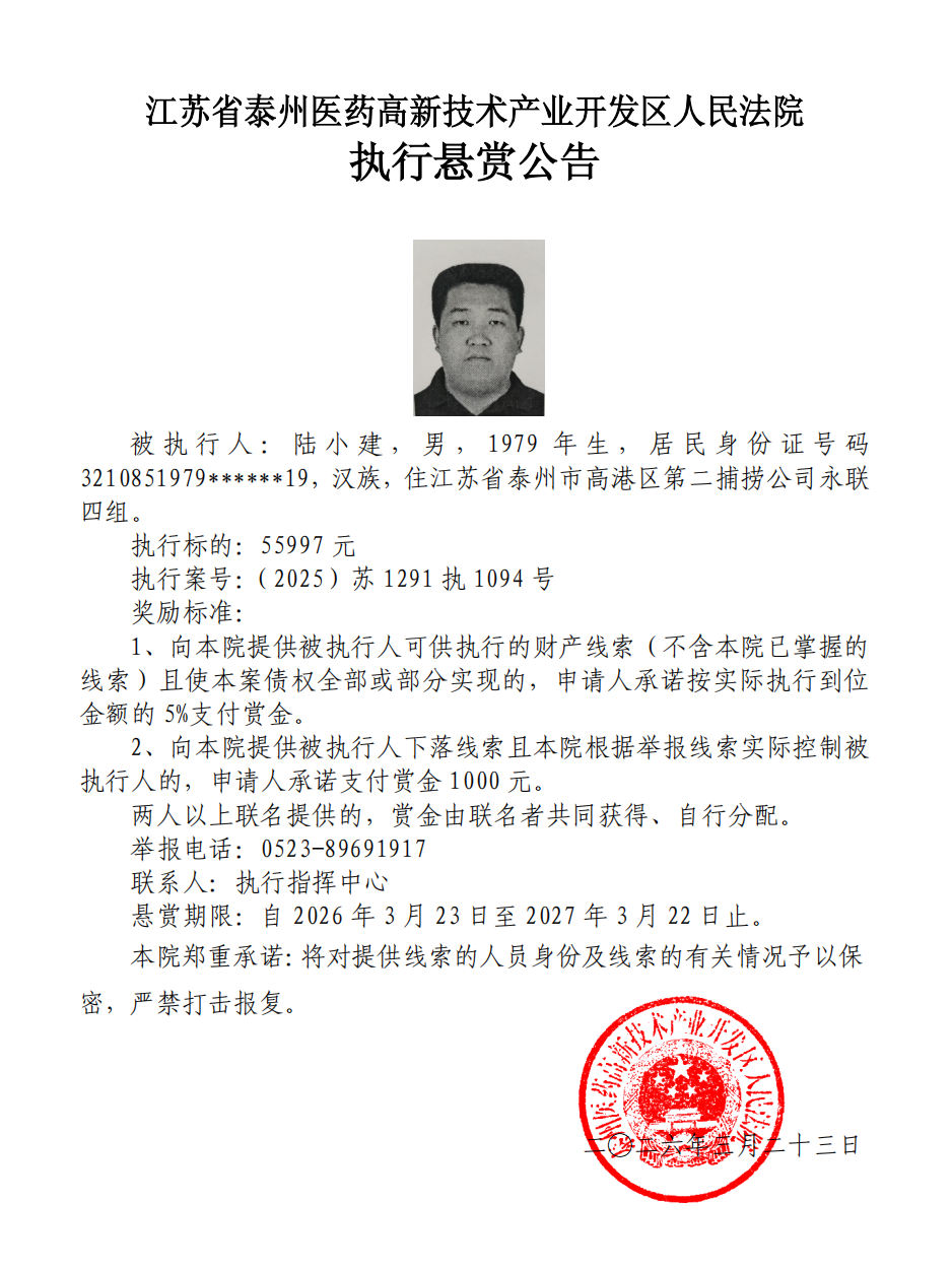 为加大案件执行力度,更好借助社会之力,有效执行生效法律文书,维护法律权威,切实保障权利人合法权益,泰州医药高新区人民法院根据相关规定,特发布执行悬赏公告如下: