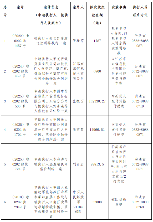青岛市市南区人民法院向案外人发放执行案款公示(2026年第4期)