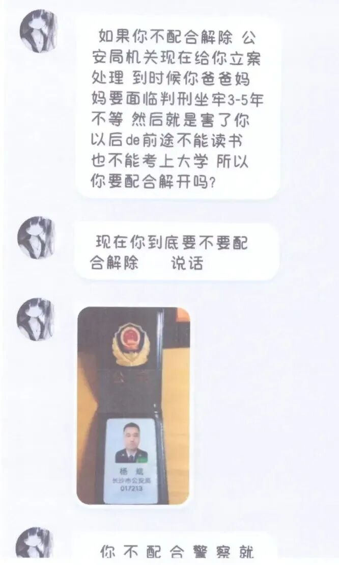 加好友后,骗子伪造警官证、网警执法文书、涉案告知函等虚假证件材料,自称“网警”“办案民警”,谎称孩子违规操作游戏、账号涉嫌违法犯罪、涉及网络案件需配合调查,利用孩子的恐惧心理制造心理压迫。