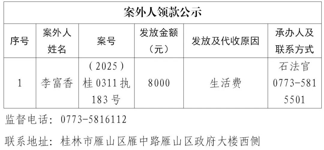 原标题:《桂林市雁山区人民法院关于向案外人发放执行案款的公示》